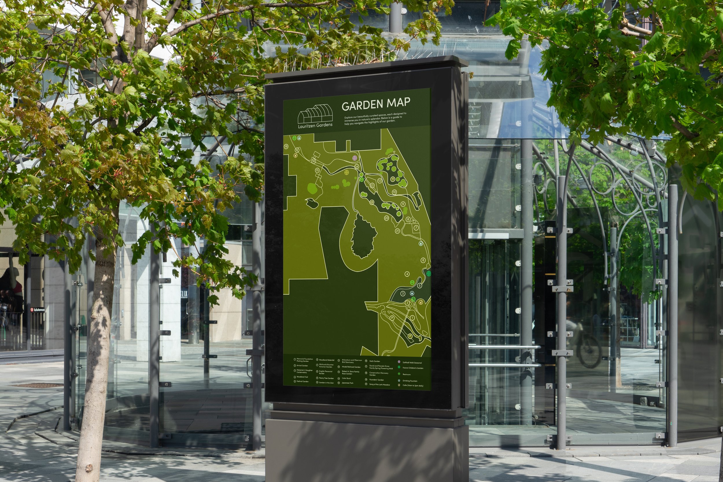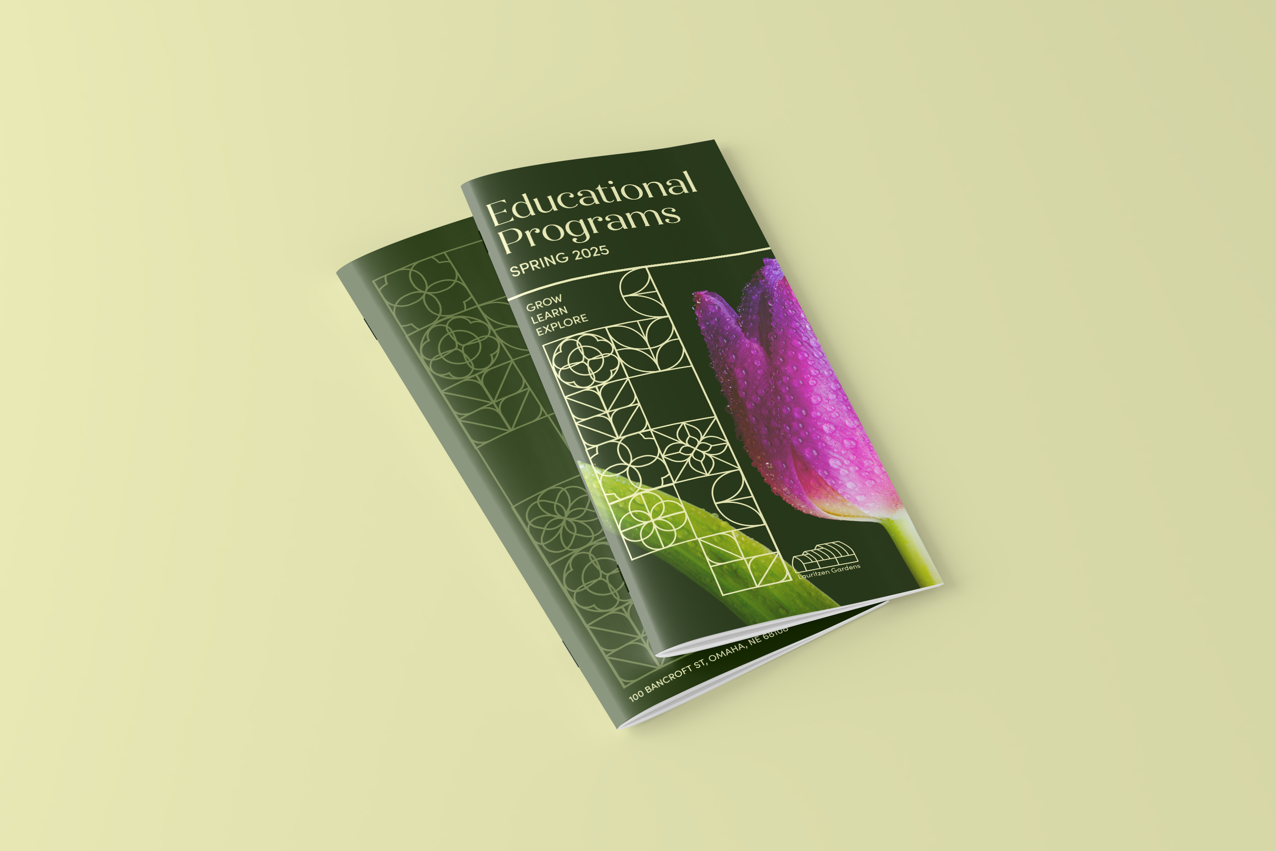Lauritzen Gardens is a 100-acre public garden nestled in South Omaha, Nebraska—an urban sanctuary that blends natural beauty with purpose. Home to a rich collection of themed gardens, educational experiences, and conservation efforts, it offers a space where nature and community thrive in harmony. In reimagining Lauritzen’s identity, my goal was to modernize its vision for continuous growth while honoring its foundational mission. I developed a geometric floral pattern as the core of the visual rebrand—an elegant, nature-inspired design that reflects the garden’s timeless beauty. This updated aesthetic invites visitors into a serene world of inspiration, discovery, and natural wonder.
